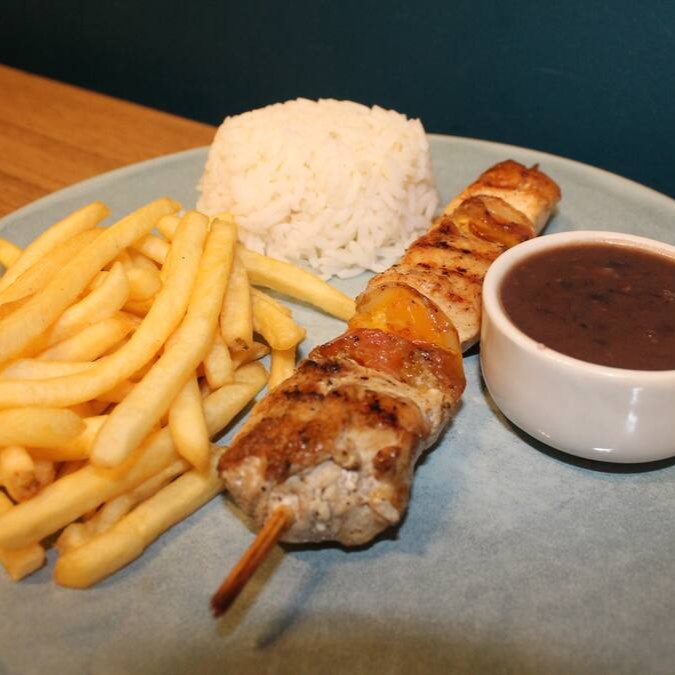 Cubos de filé de frango no espeto. Acompanha arroz branco, batata frita e feijão.