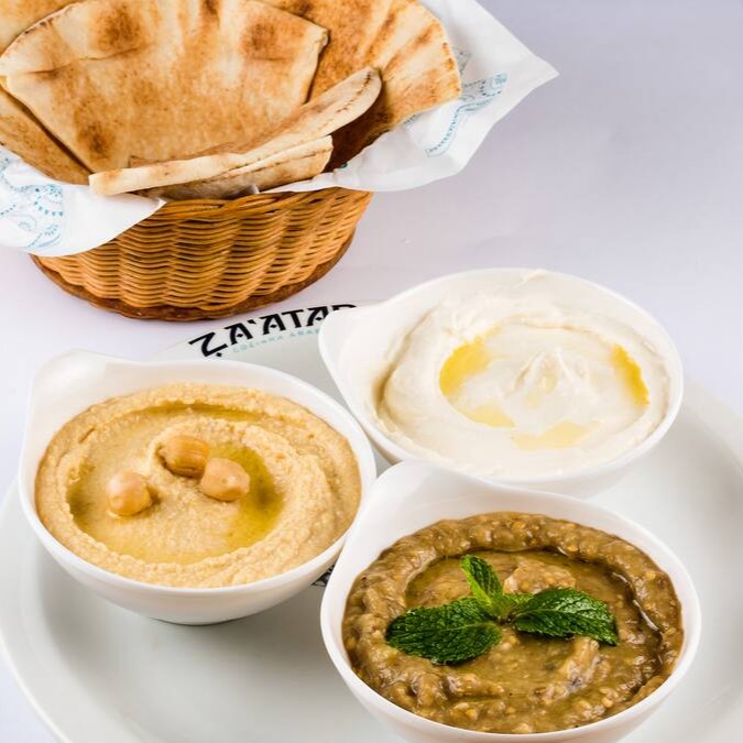Pequenas porções de Homus, Babaganuche e Coalhada Seca. Acompanha cesta de pães.