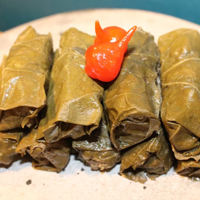 9 unidades de folhas de uva, enroladas uma a uma, com saboroso recheio de arroz e carne.