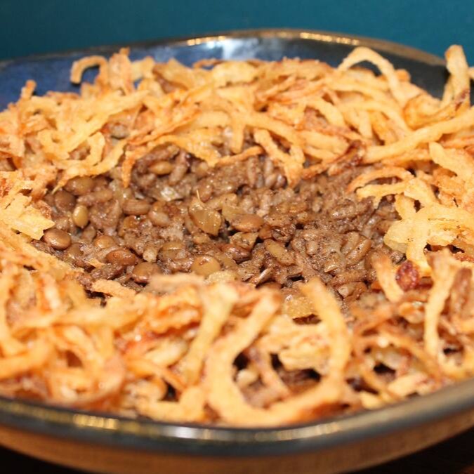 Preparado à moda árabe com especiarias e servido com cebola frita.