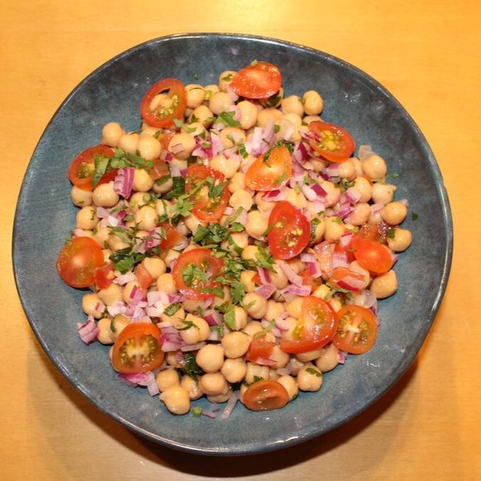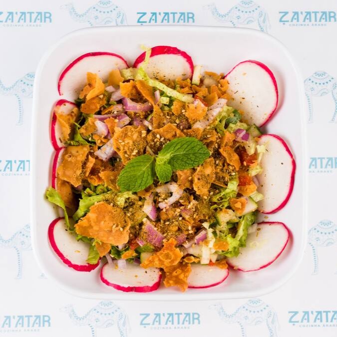 Alface, pepino, tomate, rodelas de rabanete, cebolas em fatias finas, hortelã, ervas picadas e grãos de romã. Com delicioso molho especial à base de especiarias.