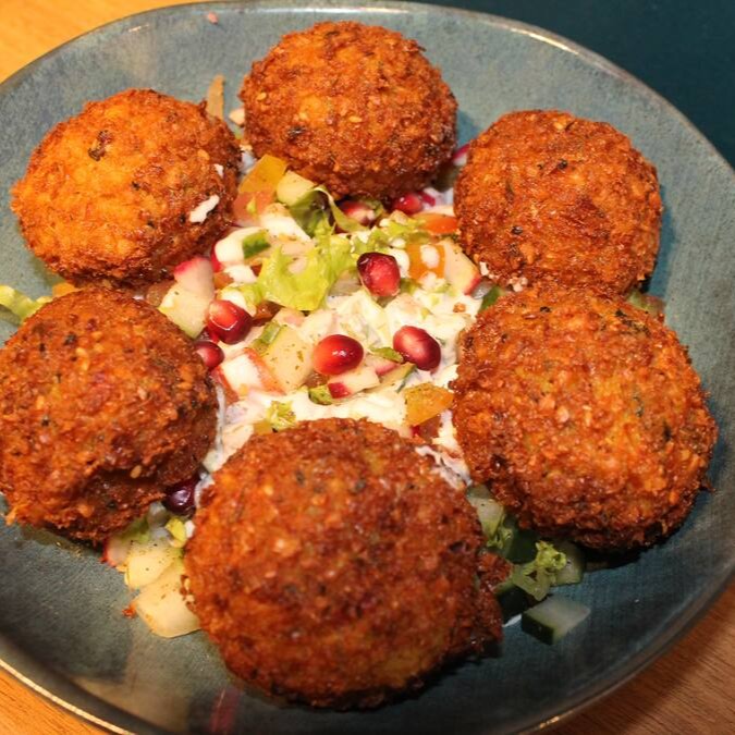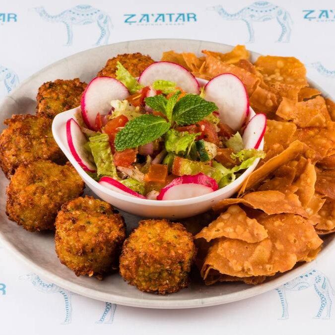 6 bolinhos crocantes de grão de bico e gergelim, com molho tahine. Acompanha salada fatouche e pão árabe.