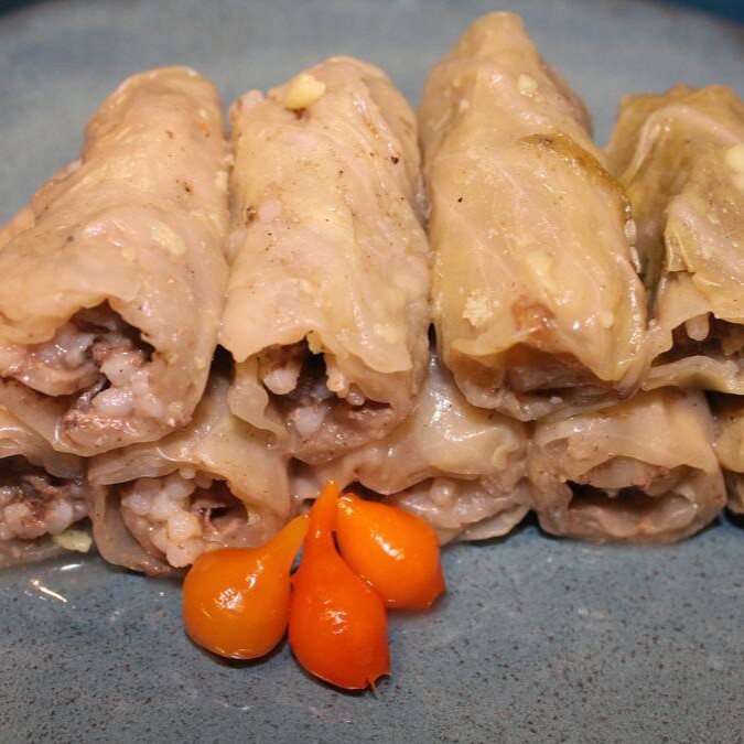 9 unidades de folhas de repolho cozido, enroladas uma a uma, com recheio de arroz e carne, temperados à nossa moda.