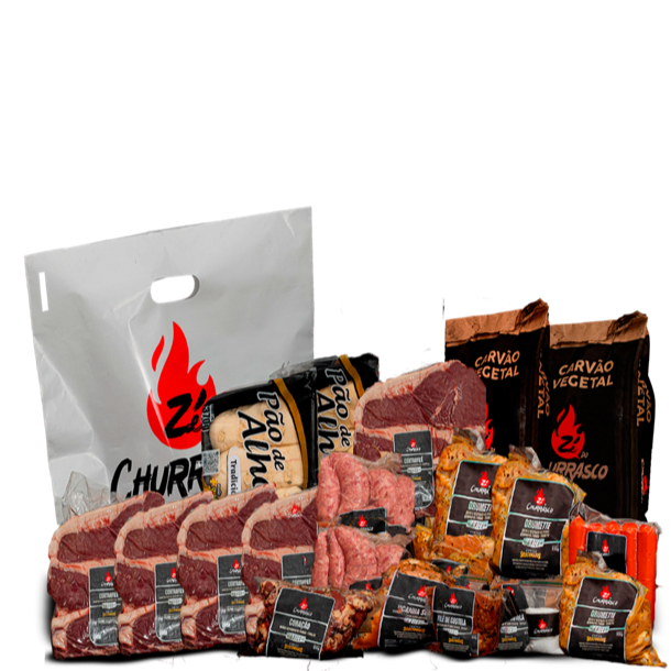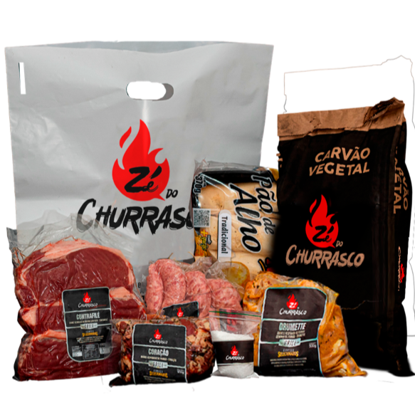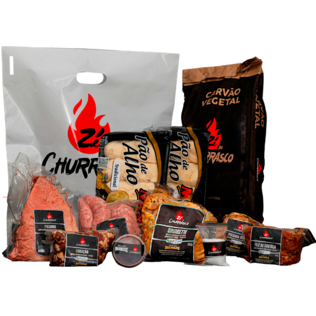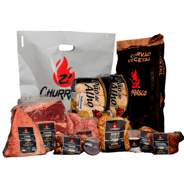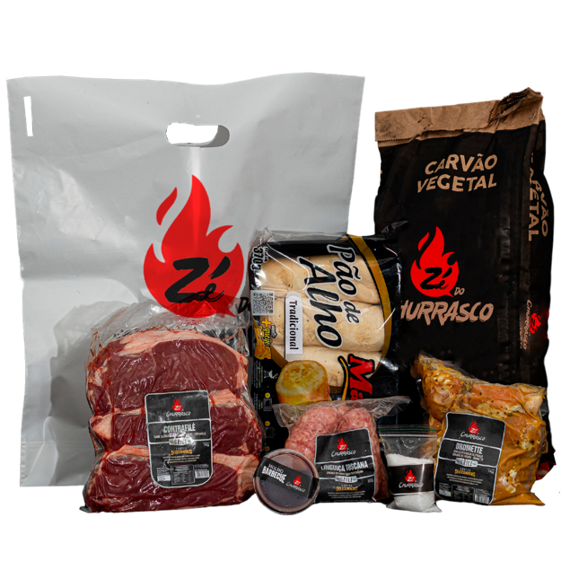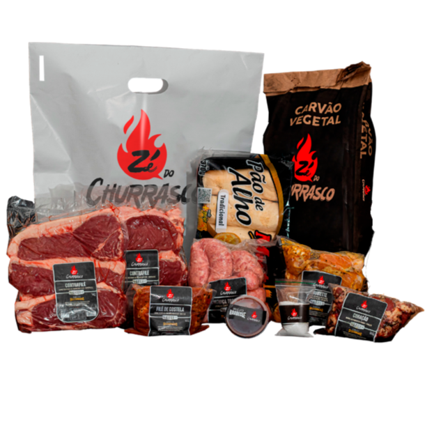 1 peça de picanha grill + aprox. 1kg de contra filé grill + aprox. 1kg de drumet ao molho de mostarda e mel + aprox. 1kg de linguiça toscana + aprox. 500g de filé de costela suína + aprox. 400g de coração no shoyu + aprox. 500g de picanha suína + 1 molho barbecue + 2 pacotes de pão de alho + 1 pacote de sal de parrilha + 1 saco de carvão + 1 acendedor