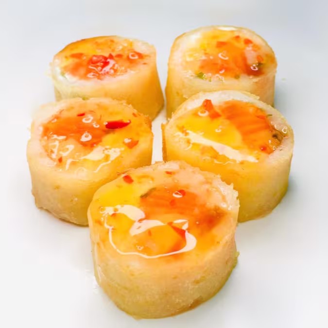 Recheio: Salmao ,Camarao,Cream Cheese,Cebolinhas Com Arroz Enrolado Em Massa De Harumaki E Geleia De Pimenta (8 Unids)