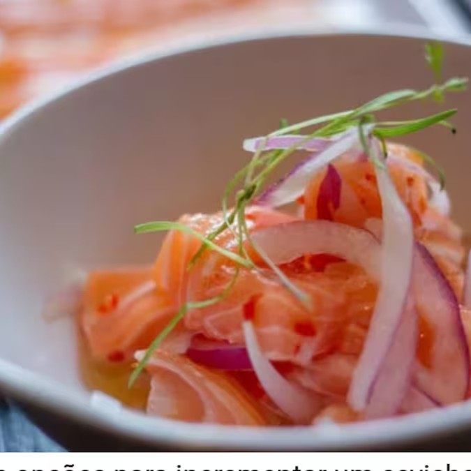 Cubos de salmao temperado em molho especial de limao,pimenta chili,cebola roxae cebolinha