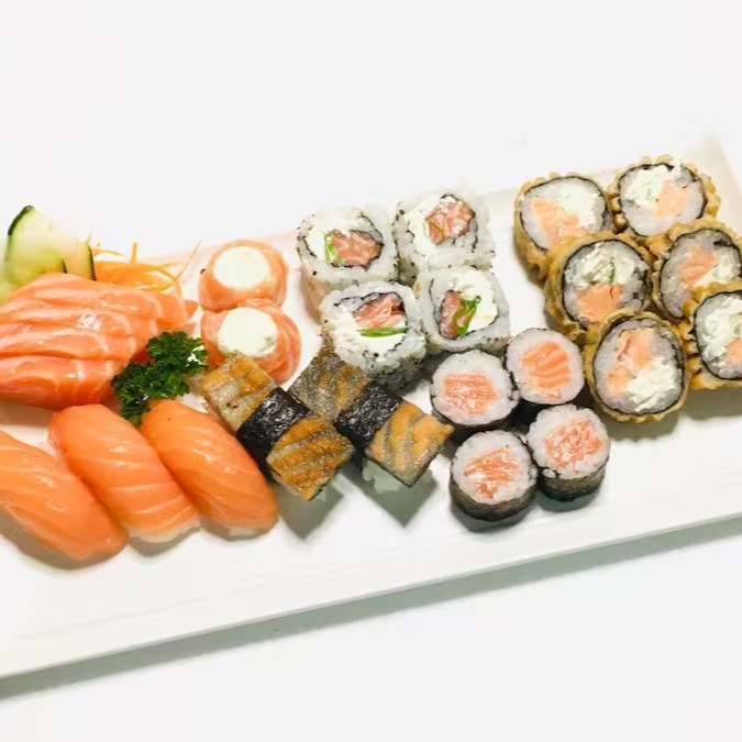 4 Sashimi, 3 Sushi. 2 Salmao Skim, 4 Salmao Maki, 6 Hot Filadelfia, 2 Joe De Salmao Com Crean Cheese