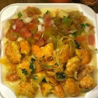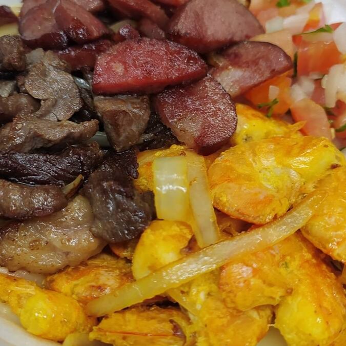 Purê de aipim com batata, arroz, vinagrete, camarão 500g.
