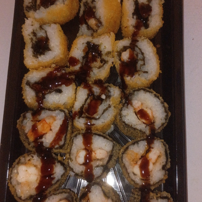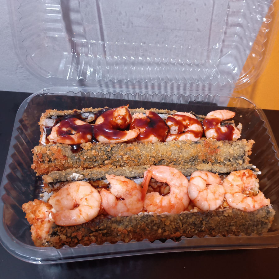 Arroz de sushi, alga, recheio cremoso, empanado crocante, finalizado com sequência de camarões frescos e selecionados.