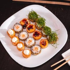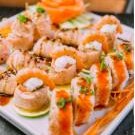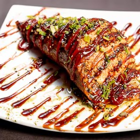 Lâmina de salmão maçaricado com recheio de salmão grelhado, kani, cream cheese, geléia de rubras, teriaki e molho de ervas.