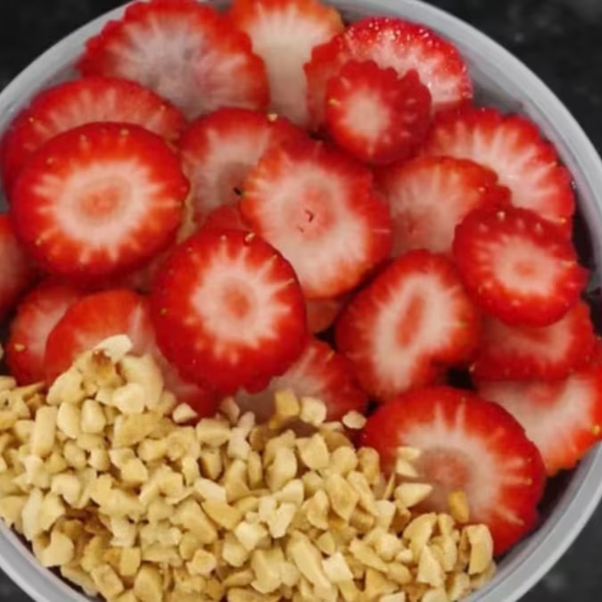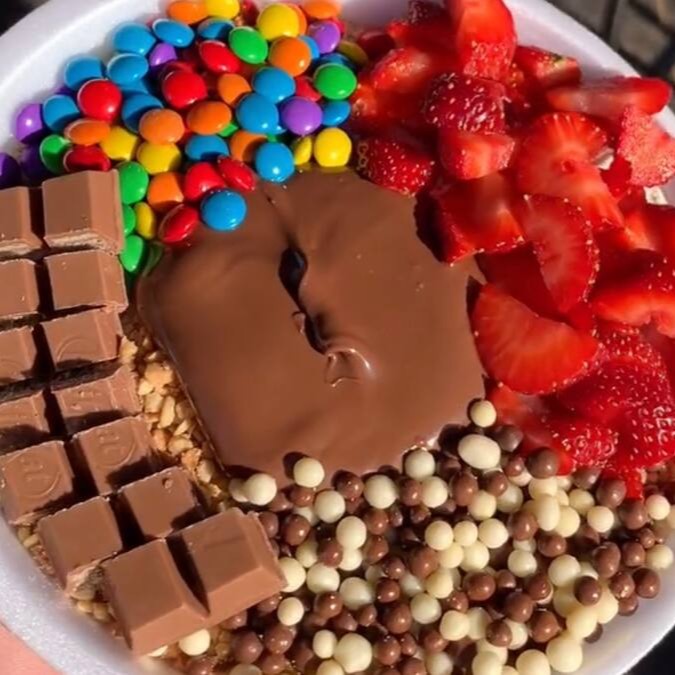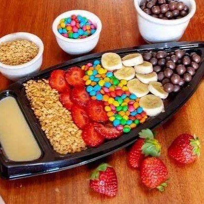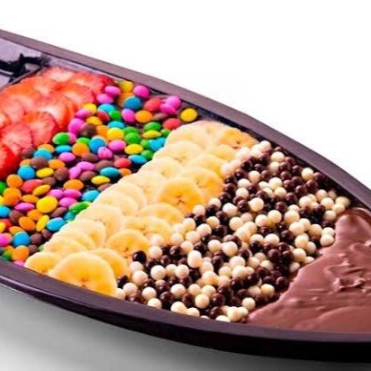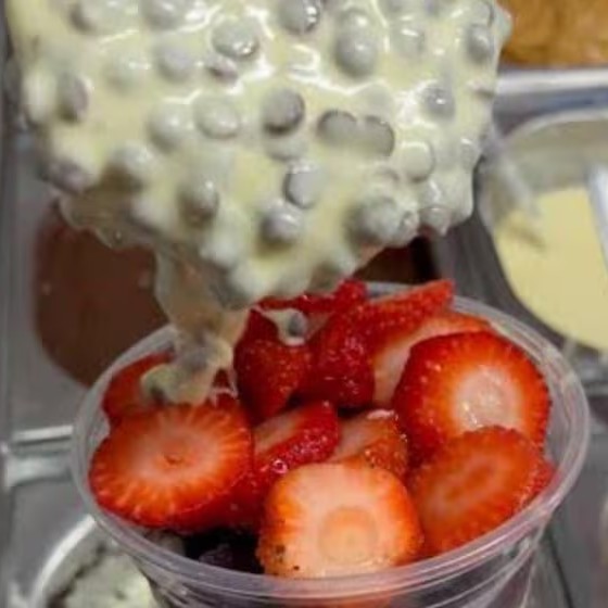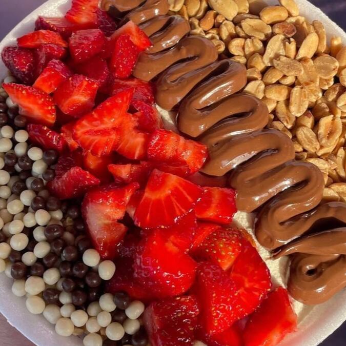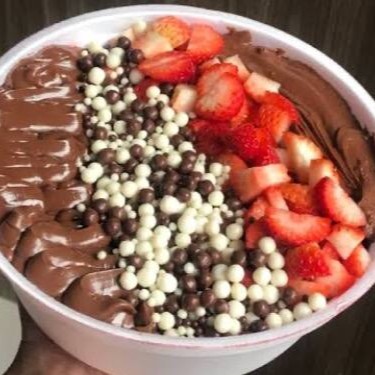 Açaí + creme de avelã + leite em pó + leite condensado + morango