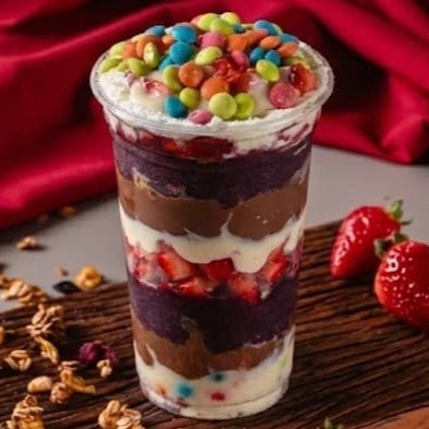 Camadas de açaí cremoso morangos frescos, Confete colorido, leite condensado e leite em pó. Uma explosão de sabor, cor e textura — o copo perfeito pra quem ama diversão em cada colherada!