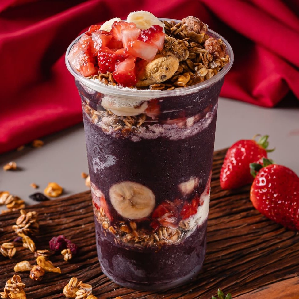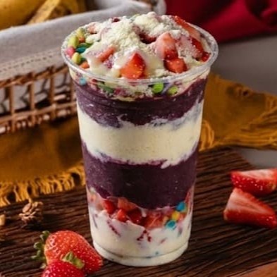 Camadas de açaí cremoso com banana, morangos frescos, granola crocante e um toque de leite em pó. Refrescante, leve e cheio de energia — perfeito pra quem ama sabor com equilíbrio!