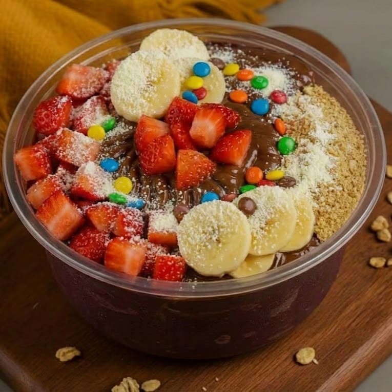 Camadas de açaí cremoso com creme de avelã, leite em pó, leite condensado, morangos frescos e Confete colorido. Um copo divertido, crocante e cheio de sabor — perfeito pra quem ama avelã e não dispensa um toque de alegria!