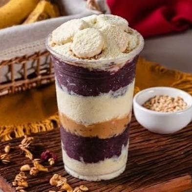 Camadas de açaí cremoso com creme de Ninho, leite em pó, leite condensado, banana e paçoca triturada. Uma combinação clássica, suave e irresistível — sabor que entrega nostalgia em cada colherada!