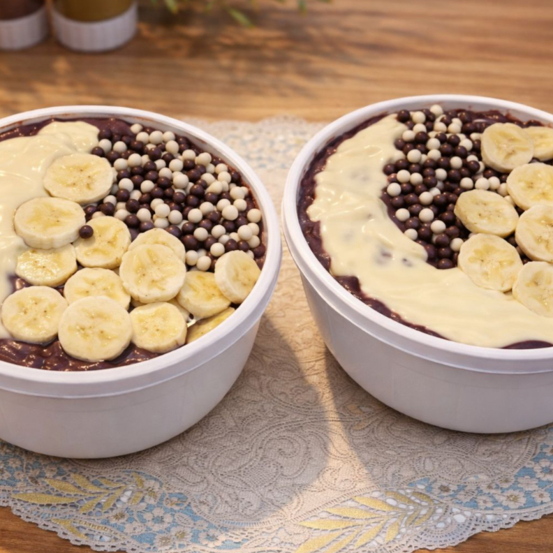Enviamos dois copos de 500ml de açaí cremoso, já acompanhados com 4 complementos da casa: creme de Ninho, paçoca, leite em pó e banana fresca. Uma combinação clássica e deliciosa! E se quiser deixar ainda mais do seu jeito, é só adicionar mais complementos no final do cardápio.