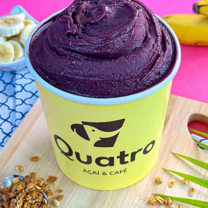 Açaí no pote de 360ml com adicionais separados de banana, granola e leite em pó.