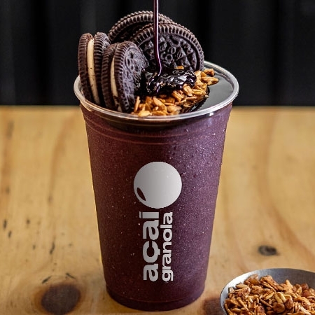 nosso açaí batido acompanhado com calda de chocolate, granola e biscoito negresco.