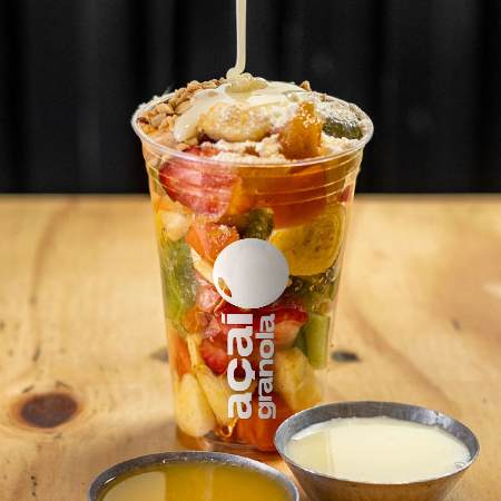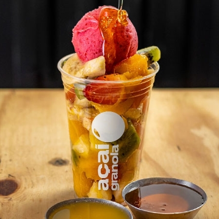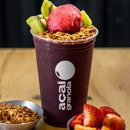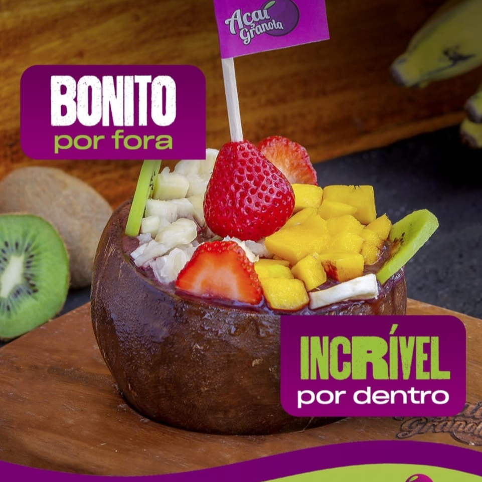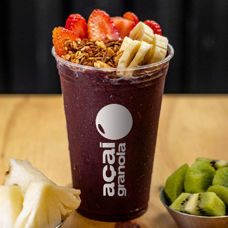 nosso acaí batiddo sem xarope de guaraná, acompanhada com morango, kiwi, banana, abacaxi e uma granola super crocante.