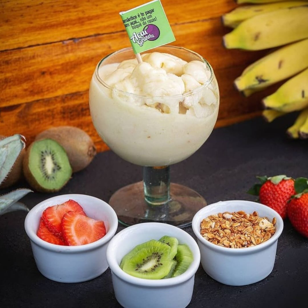 nosso açaí batido, sem xarope de guaraná acompanhado por banana ,morango, manga ,kiwi, abacaxi e nossa granola super crocante.