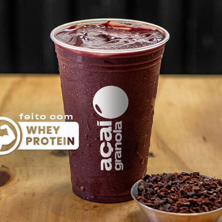 Nosso açaí batido com whey protein e acompanhado com nibs de cacau.