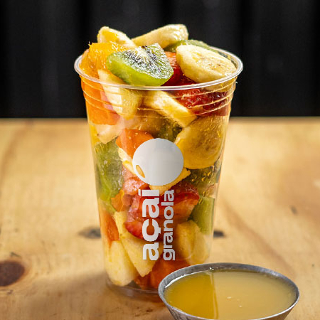 nossa salada de frutas cortadas na hora , que mantém o frescor e o sabor da fruta.