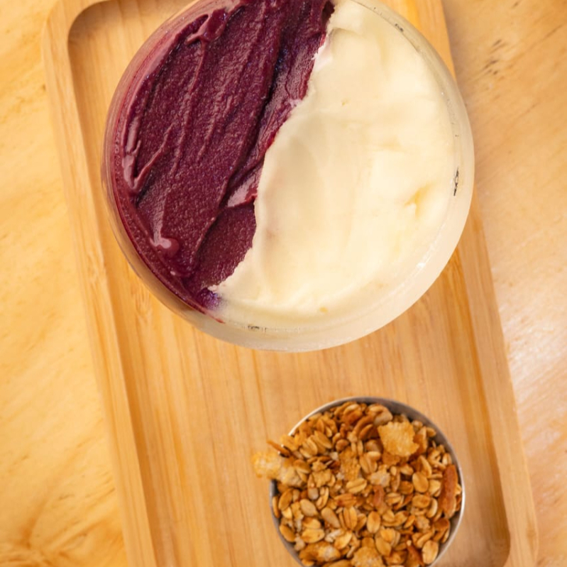 aquela combinação clássica: metade o saboroso creme de cupuaçú, metade nosso creme de açaí sem xarope. Tudo isso acompanhado por da melhor granola, tia Sônia.