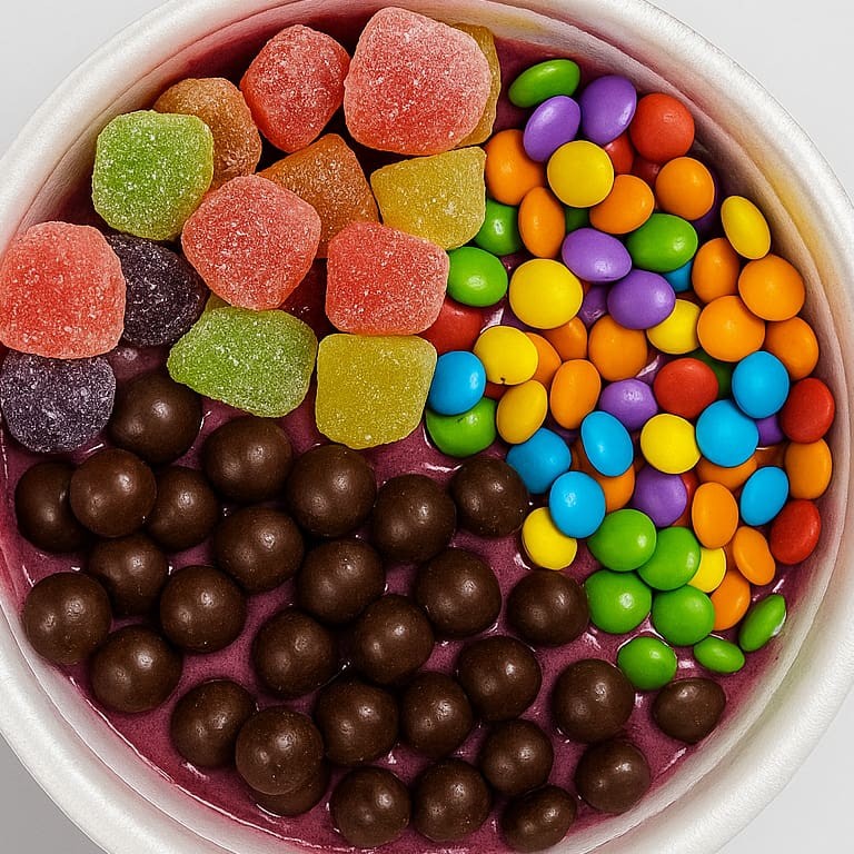 Açaí sabor tradicional com jujuba, chocoball e chococandy. Colorido, divertido e delicioso! Uma explosão de alegria no pote, pensado para os pequenos (e também para os adultos que amam doce!).