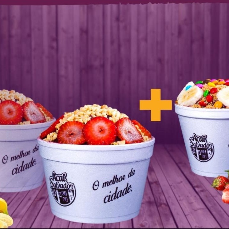 Na compra de 02 açaí de 480ml com 03 acompanhamentos que vão em camadas dentro do açai. Ganhe 01 açai de 360ml com 03 acompanhamentos de cortesia,