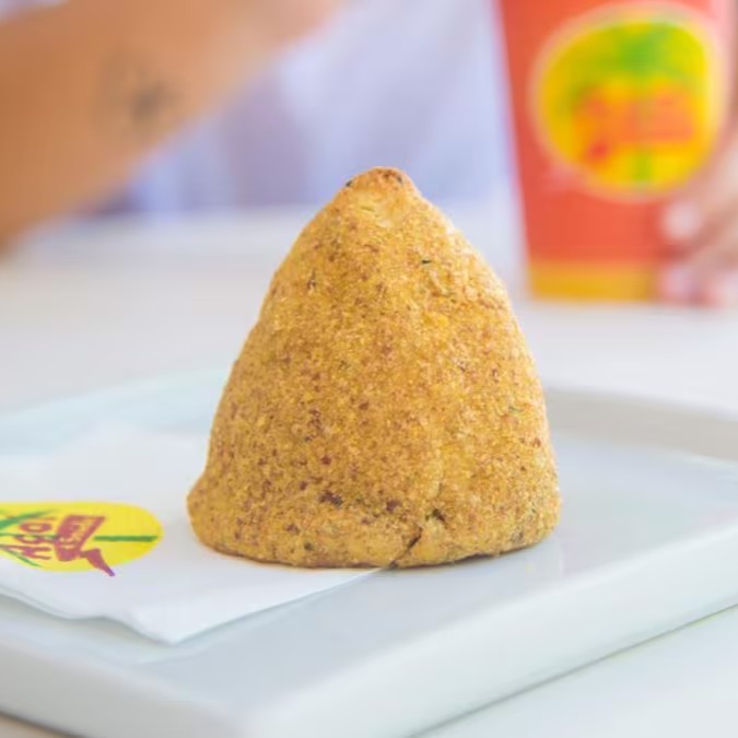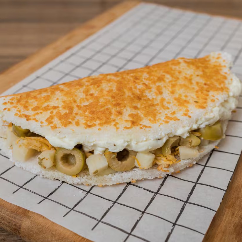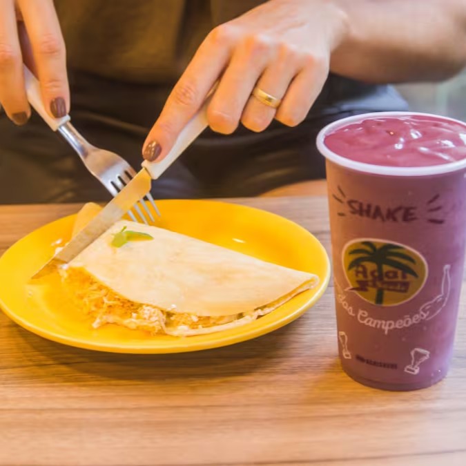 Beiju de frango desfiado, queijo mussarela e requeijão cremoso com massa gratinada + Shake Tropical protein( Açaí, banana, morango, abacaxi, whey protein de morango com ou sem xarope de Guaraná) 500ml
