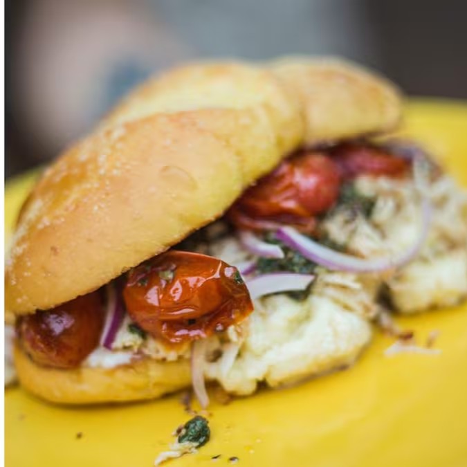 Pão baguete tostado na chapa, molho pesto, frango desfiado, tomate confit, cebola roxa, mussarela de búfala, cream cheese
