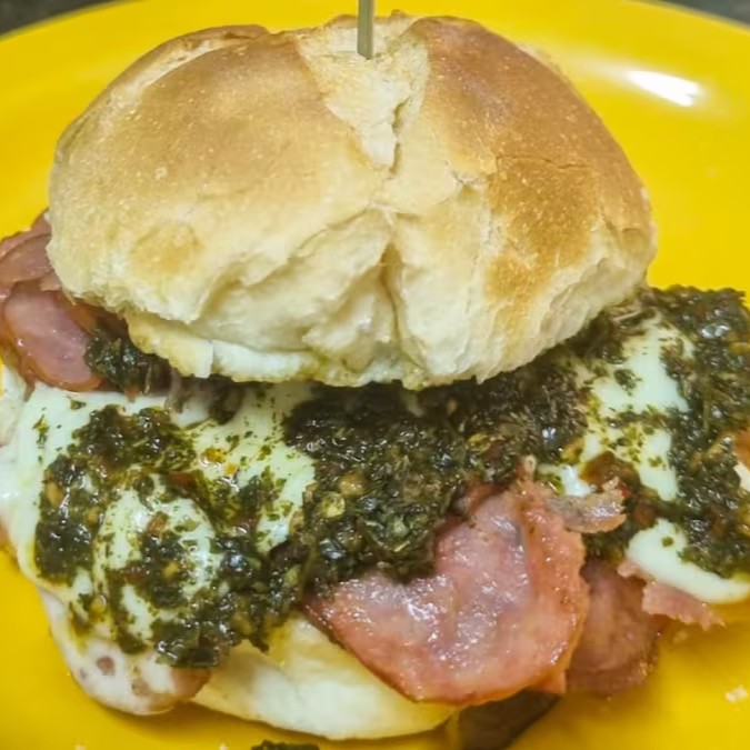 Pão bola de sal, calabresa chapeada, queijo mussarela, cebola caramelizada e molho chimichuri.