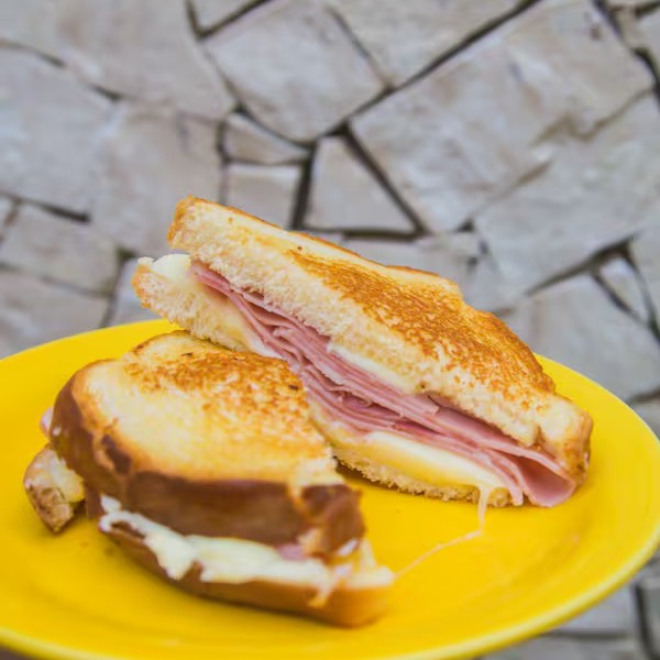 Misto quente especial, pão de forma, queijo, presunto e requeijão cremoso + suco de morango 500ml.