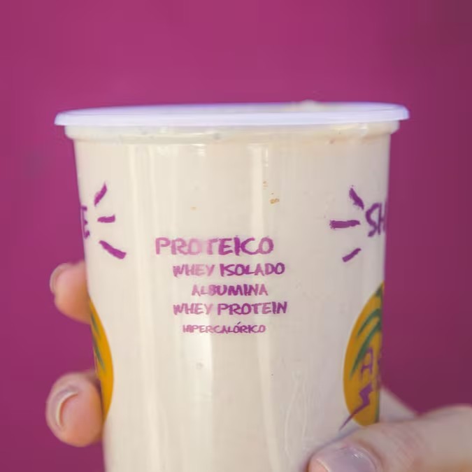 Leite, banana, pasta de amendoim, whey protein, Guaraná em pó.