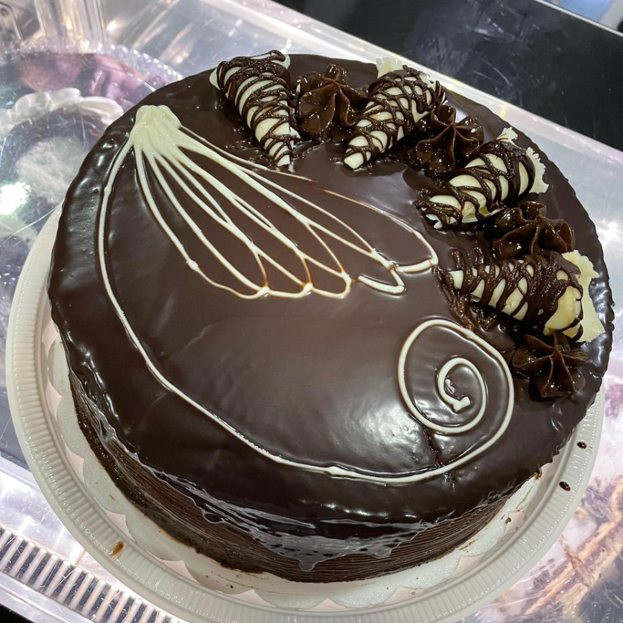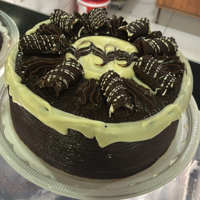 Bolo branco, bolo de chocolate, recheio de creme trufado de chocolate, recheio de doce de leite, cobertura de doce de leite de chocolate, decorada com pitangas de brigadeiro branco, cones de chocolate e ganache branco na lateral.