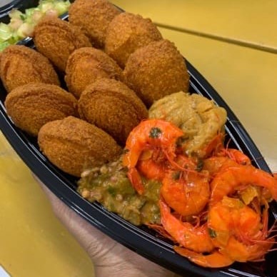 Porção mista 10 bolinhos + 2 abarás Vatapá, caruru, salada e camarão.