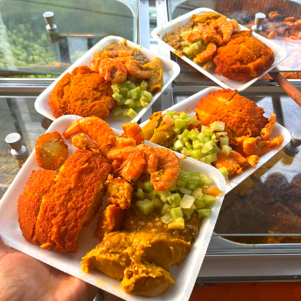 Abará, vatapá, caruru, camarão, salada e pimenta