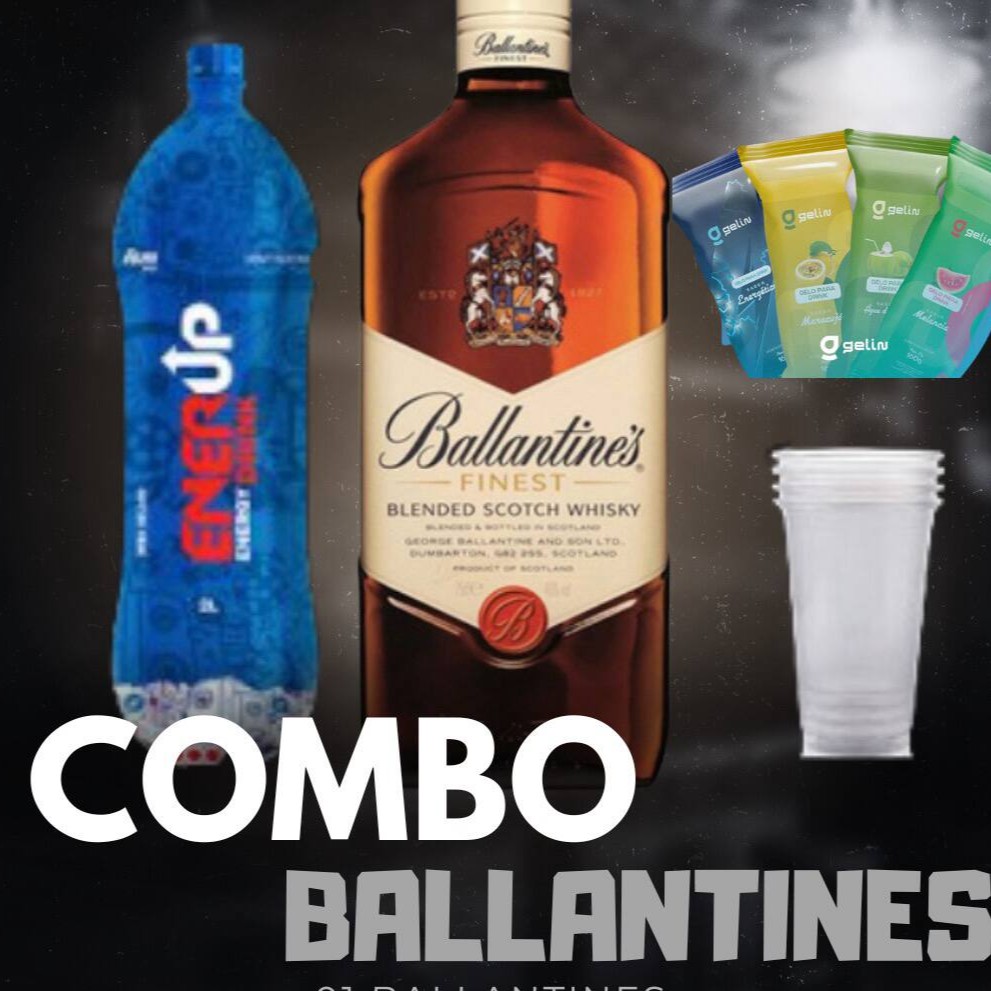 1- Whisky Ballantines Finest 1 litro. 1- Energético Enerup 2 litros. 4- Gelo para Drinks sabor a sua escolha 4- Copao de 500 ml
