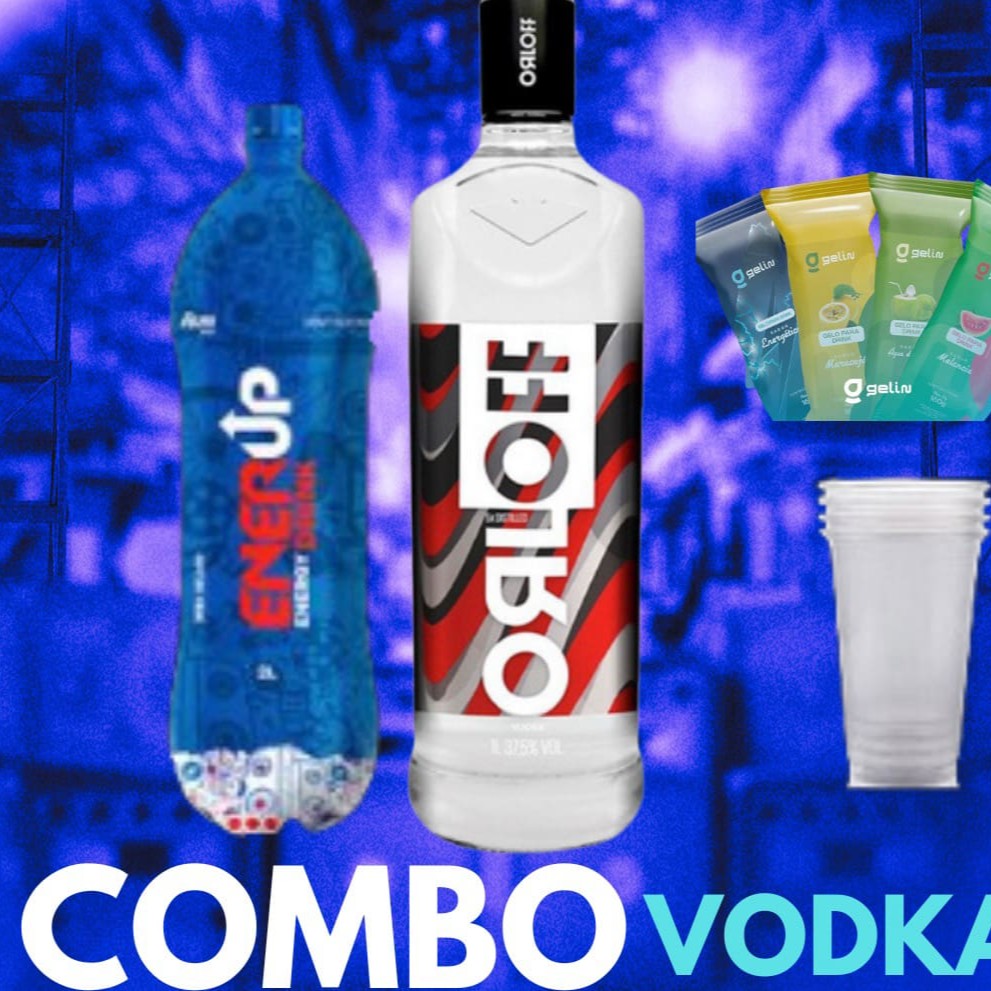 1- Vodka Orloff 1 litro. 1- Energético Enerup 2 litros. 4- Gelo para Drinks sabor a sua escolha 4- Copao de 500 ml