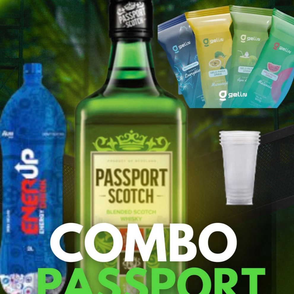 1- Whisky Passaport 1 litro. 1- Energético Enerup 2 litros. 4- Gelo para Drinks sabor a sua escolha 4- Copao de 500 ml
