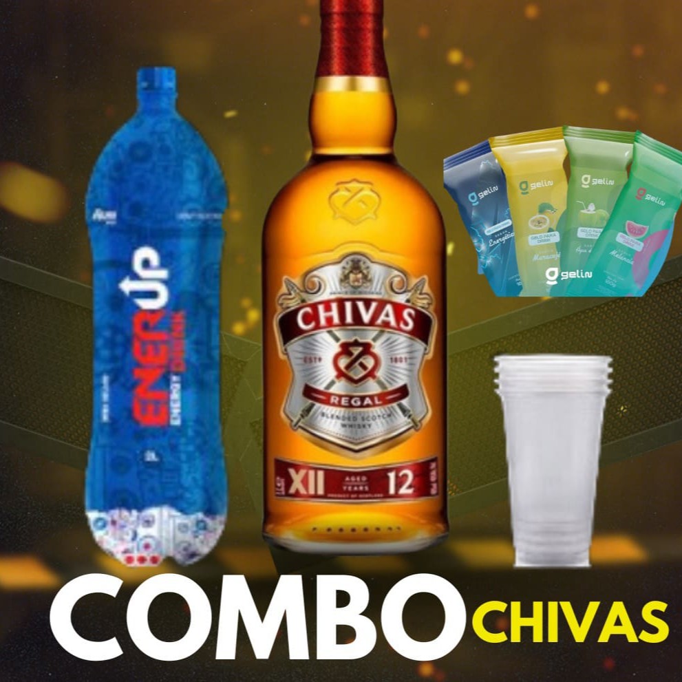 1- Whisky Chivas Regal 1 litro. 1- Energético Enerup 2 litros. 4- Gelo para Drinks sabor a sua escolha 4- Copao de 500 ml