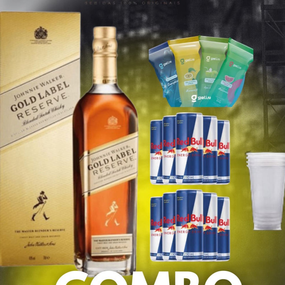1- Whisky Johnnie Walker Gold Label 1 litro. 10- Red Bull Energético de 250ml. 4- Gelo para Drinks sabor a sua escolha 4- Copao de 500 ml