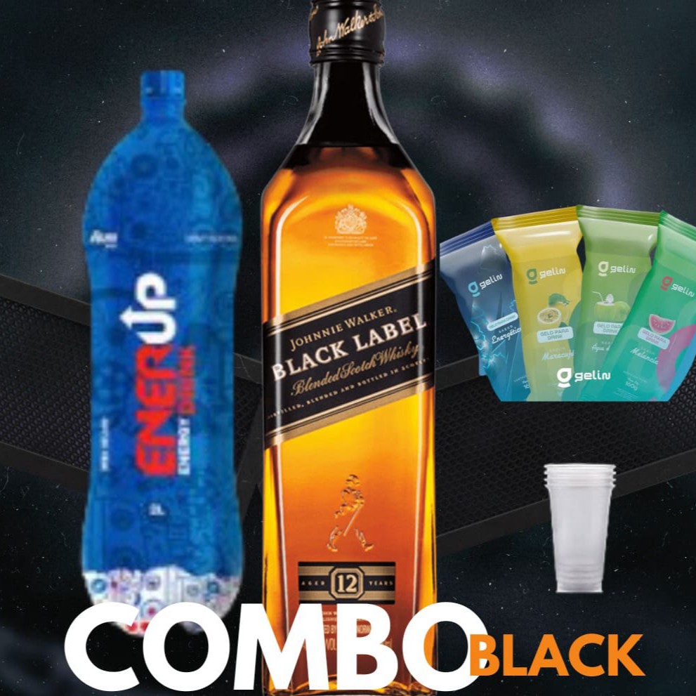 1- Whisky Johnie Walker Black Label 1 litro. 1- Energético Enerup 2 litros. 4- Gelo para Drinks sabor a sua escolha 4- Copao de 500 ml