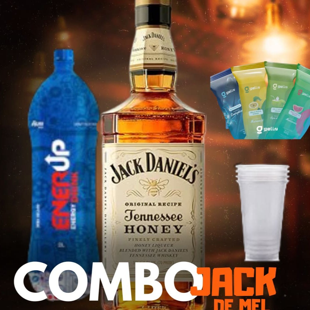 1- Jack Daniels Honey( mel) 1 litro. 1- Energético Enerup 2 litros. 4- Gelo para Drinks sabor a sua escolha 4- Copao de 500 ml