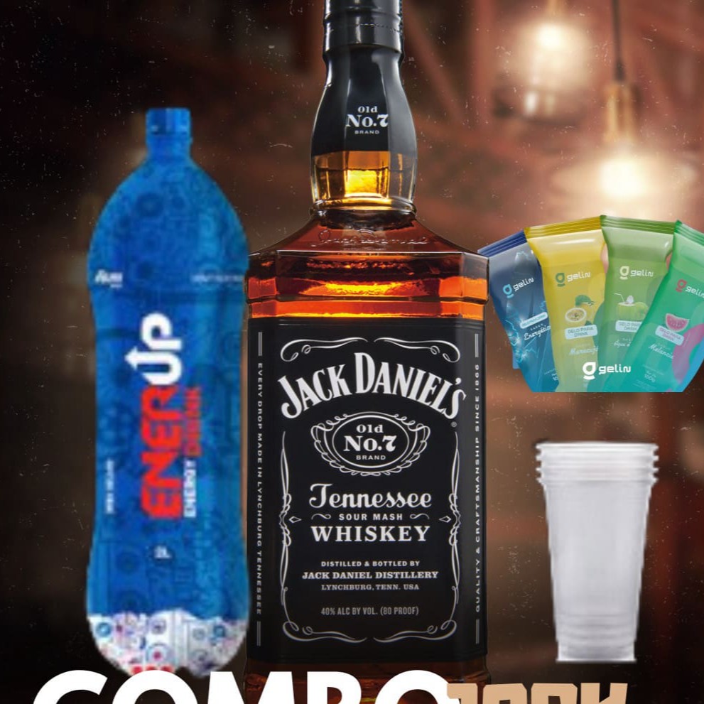 1- Jack Daniels 07 Tradicional 1 litro. 1- Energético Enerup 2 litros. 4- Gelo para Drinks sabor côco 4- Copao de 500 ml