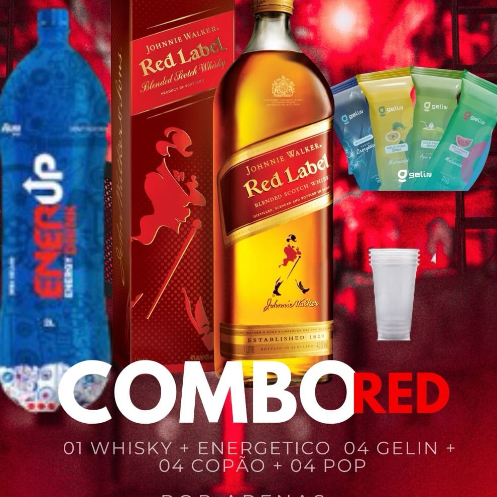 1- Whisky Red Label 1 litro. 1- Energético Enerup 2 litros. 4- Gelo para Drinks sabor côco 4- Copao de 500 ml