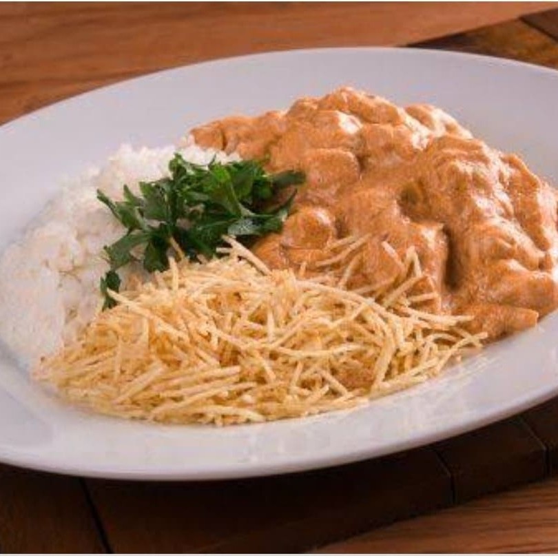 Delicioso Strogonoff de frango, deliciosamente preparado a base de creme de leite, bem temperado, com sabor irresistível! Acompanha arroz branco e batata palha.