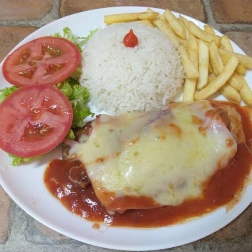 Delicioso Parmegiana de Carne (Filé especial de alcatra), coberto com fatias de queijo e regado com delicioso molho de tomate caseiro. E você poderá escolher suas combinações: Com purê ou fritas!