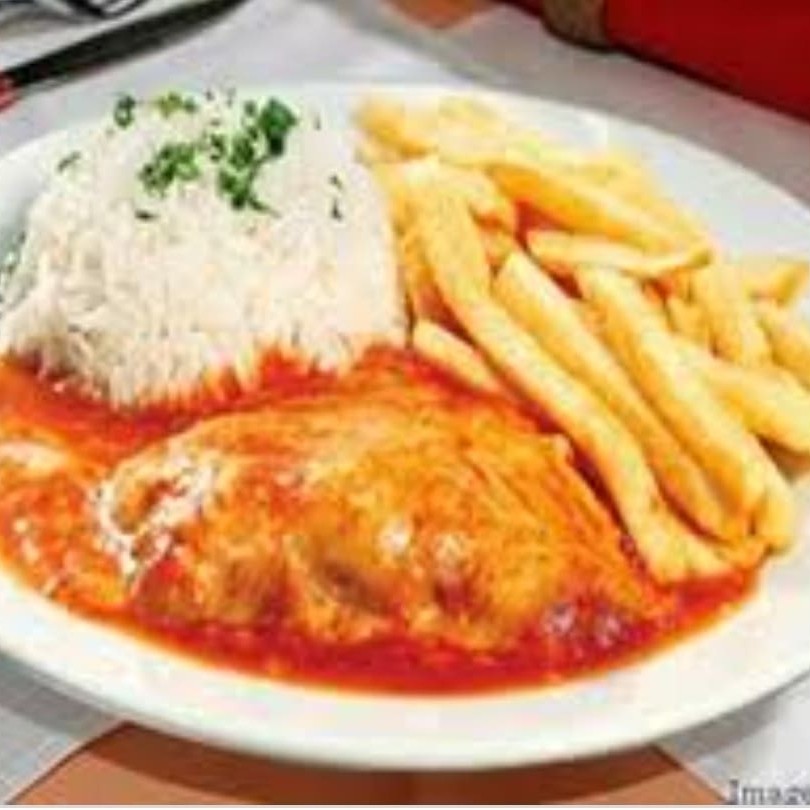 Este suculento Parmegiana de Frango, é feito com o filé do frango, coberto com fatias de queijo e regado a um delicioso molho de tomate caseiro! Acompanha arroz branco e batata frita!