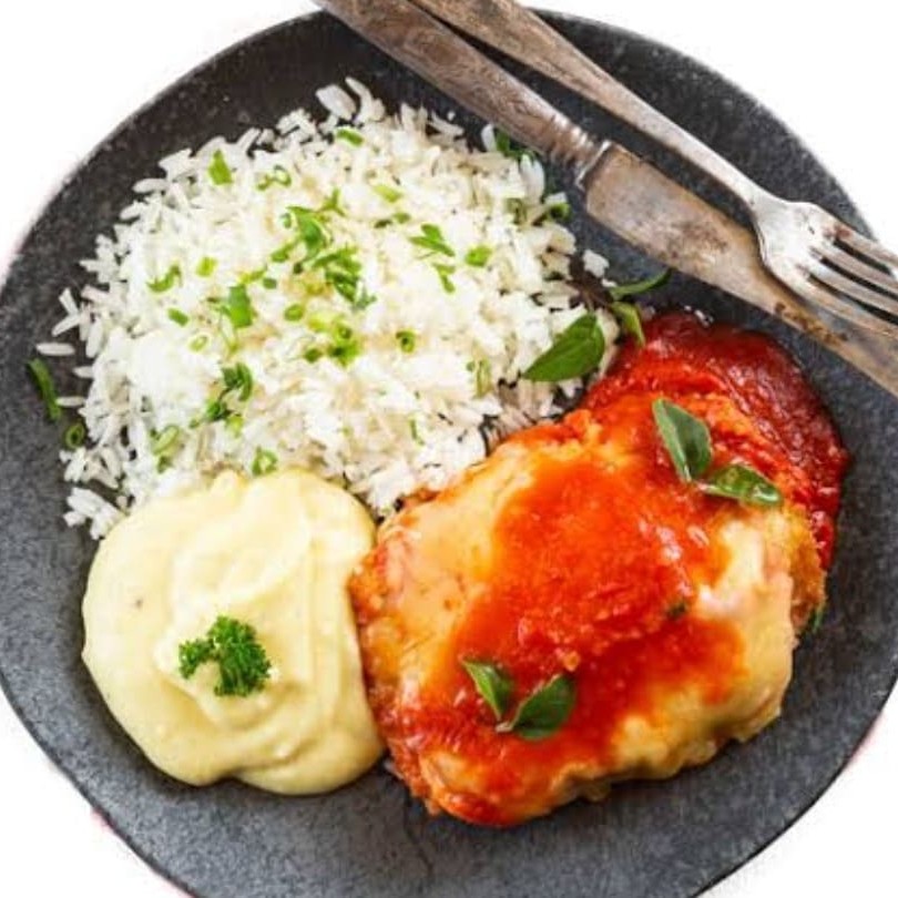Delicioso Parmegiana de Frango, envolvido com fatias de queijo derretidas e, ao um delicioso molho de tomate caseiro, acompanhado de arroz branco, e um verdadeiro Purê de batata.
